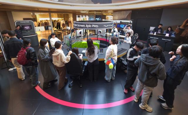 관람객들이 삼성 오디세이 게이밍 모니터와 갤럭시 스마트폰으로 게임 플레이를 경험할 수 있는 `오디세이 게임 스테이션` 팝업 체험존을 방문하고 있다